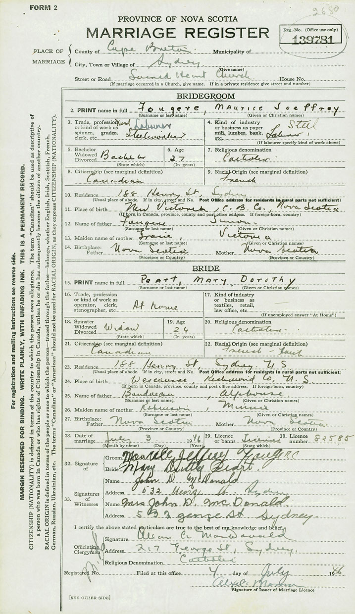 28. Date of marriage July 3 1946 29. By license or banns License 30. License number 82585