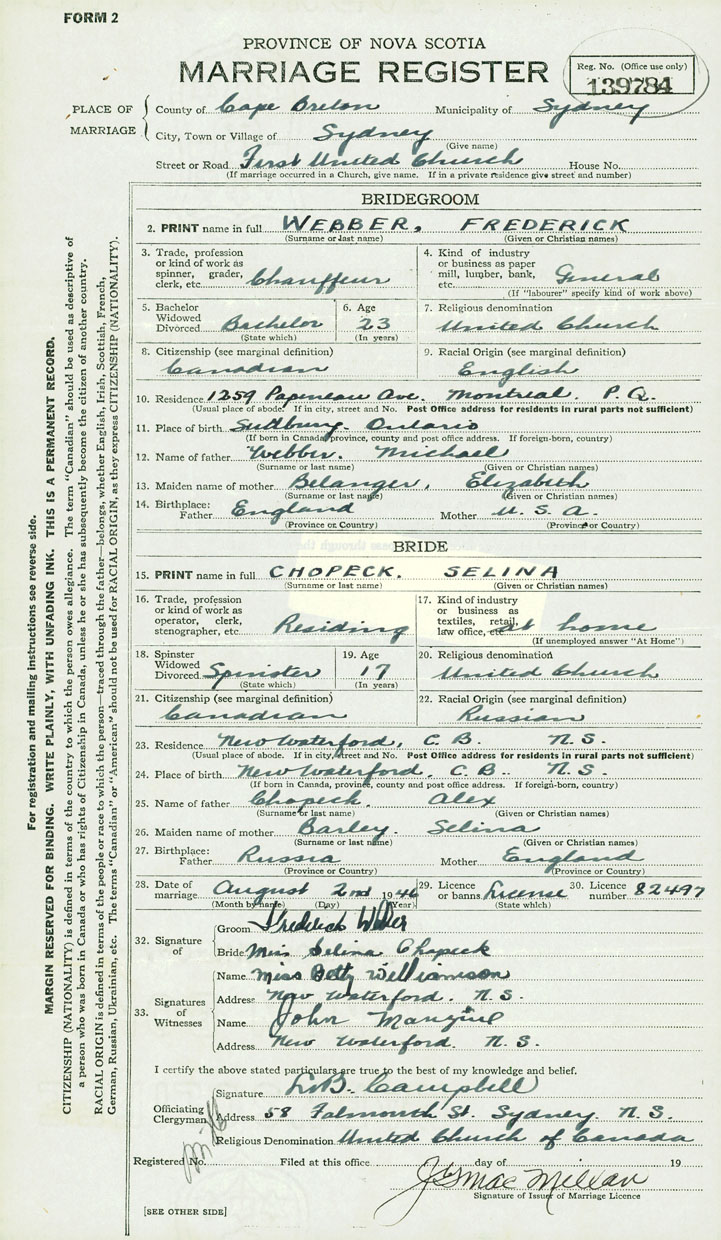 28. Date of marriage August 2 1946 29. By license or banns License 30. License number 82497