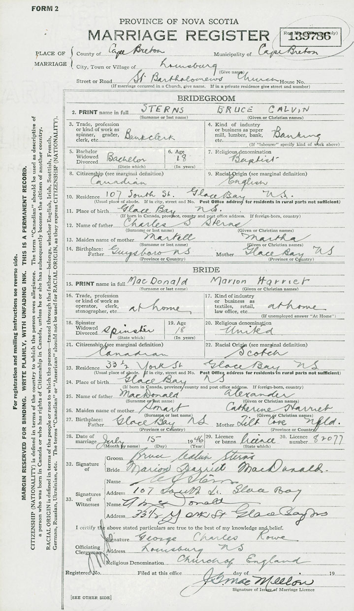 28. Date of marriage July 15 1946 29. By license or banns License 30. License number 82077