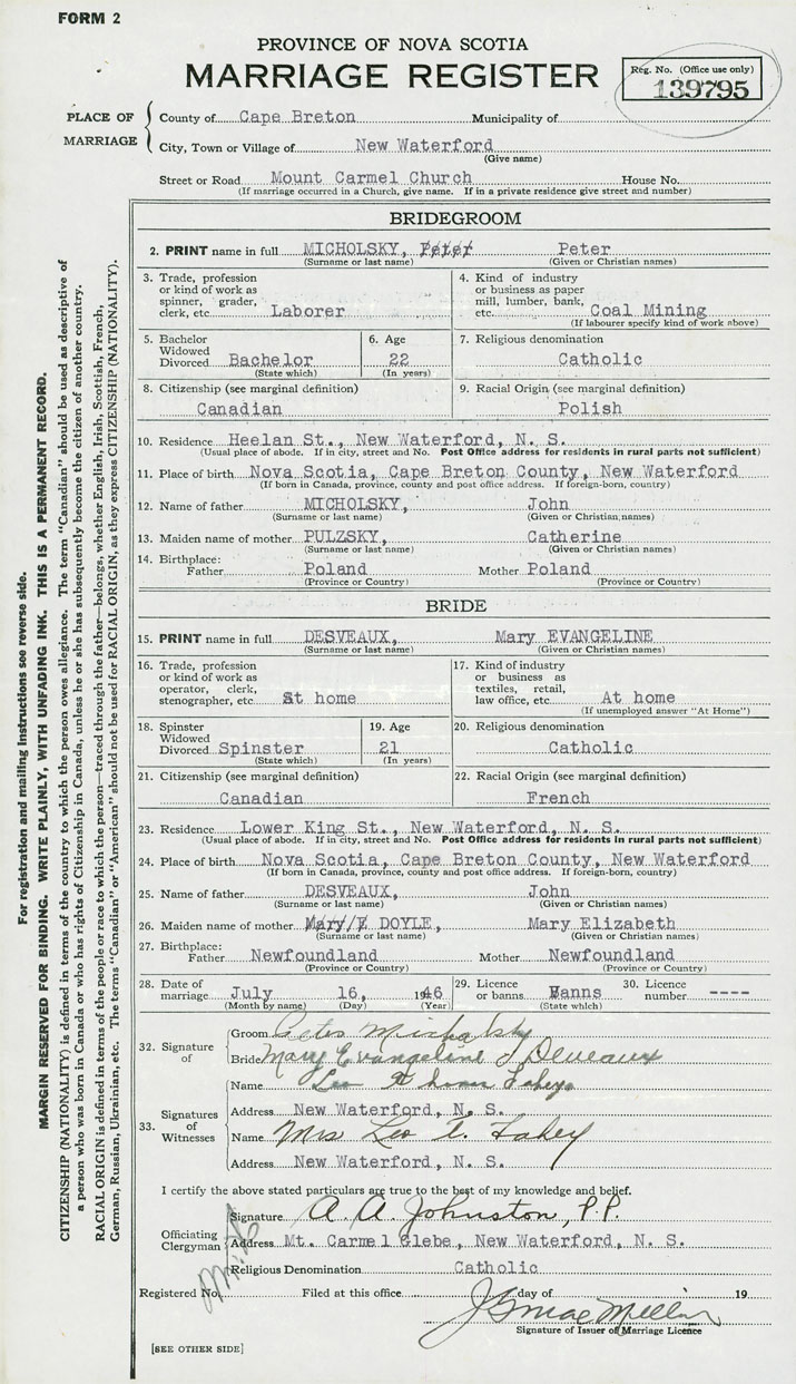 24. Place of birth New Waterford, Cape Breton County