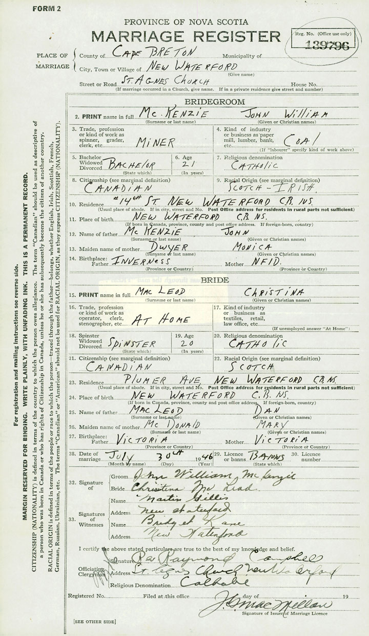 PLACE OF MARRIAGE County of Cape Breton