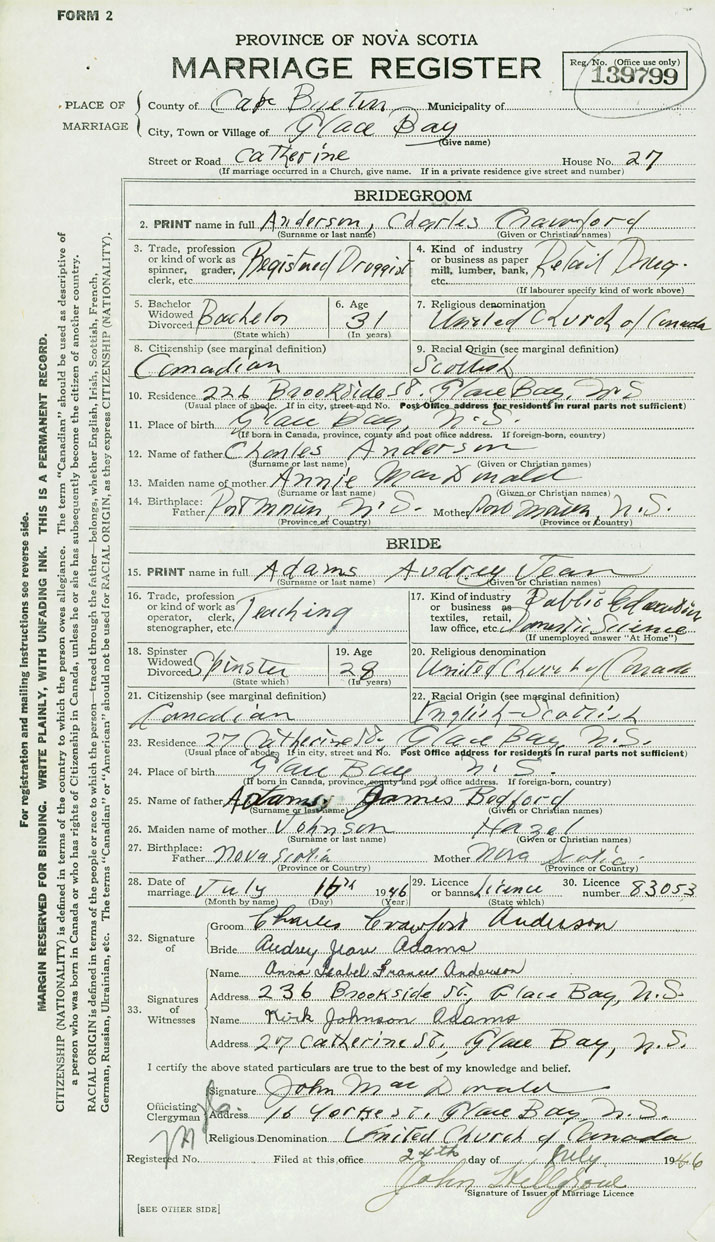 28. Date of marriage July 16 1946 29. By license or banns License 30. License number 83053