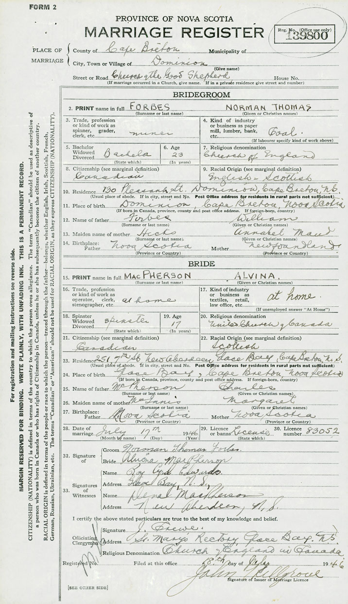 28. Date of marriage July 17 1946 29. By license or banns License 30. License number 83052