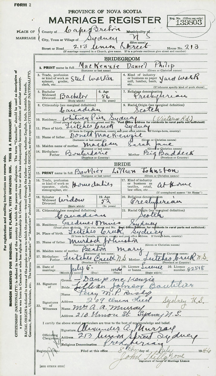 11. Place of birth Leitches Creek, Cape Breton