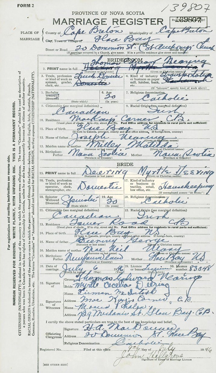28. Date of marriage July 6 1946 29. By license or banns License 30. License number 83048