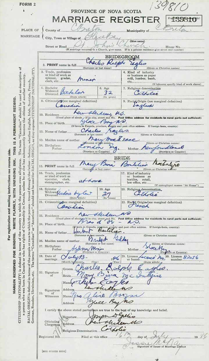 27. Birthplace Father Sydney Mines Mother Glace Bay