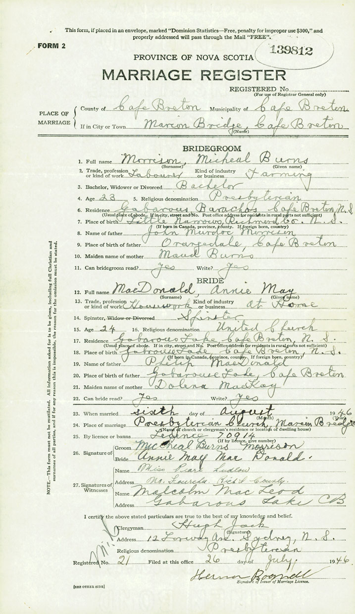 PLACE OF MARRIAGE County of Cape Breton in City or Town Marion Bridge