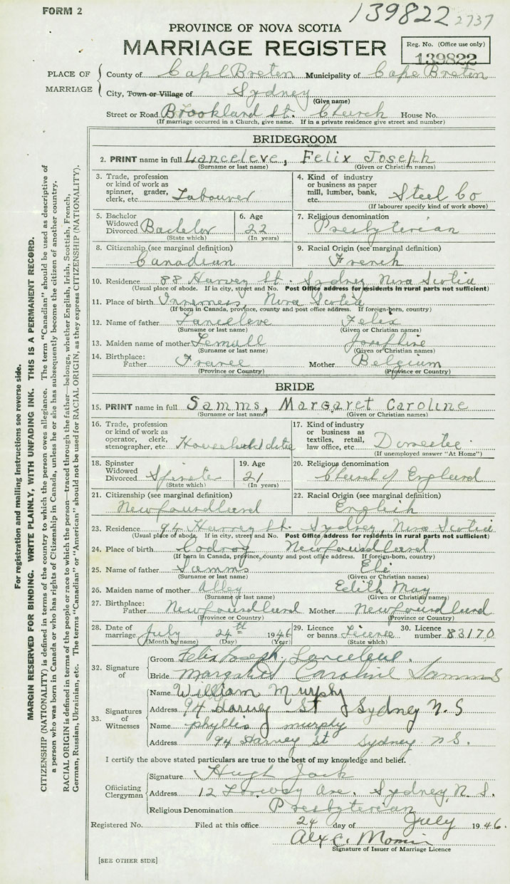 28. Date of marriage July 24 1946 29. By license or banns License 30. License number 83170
