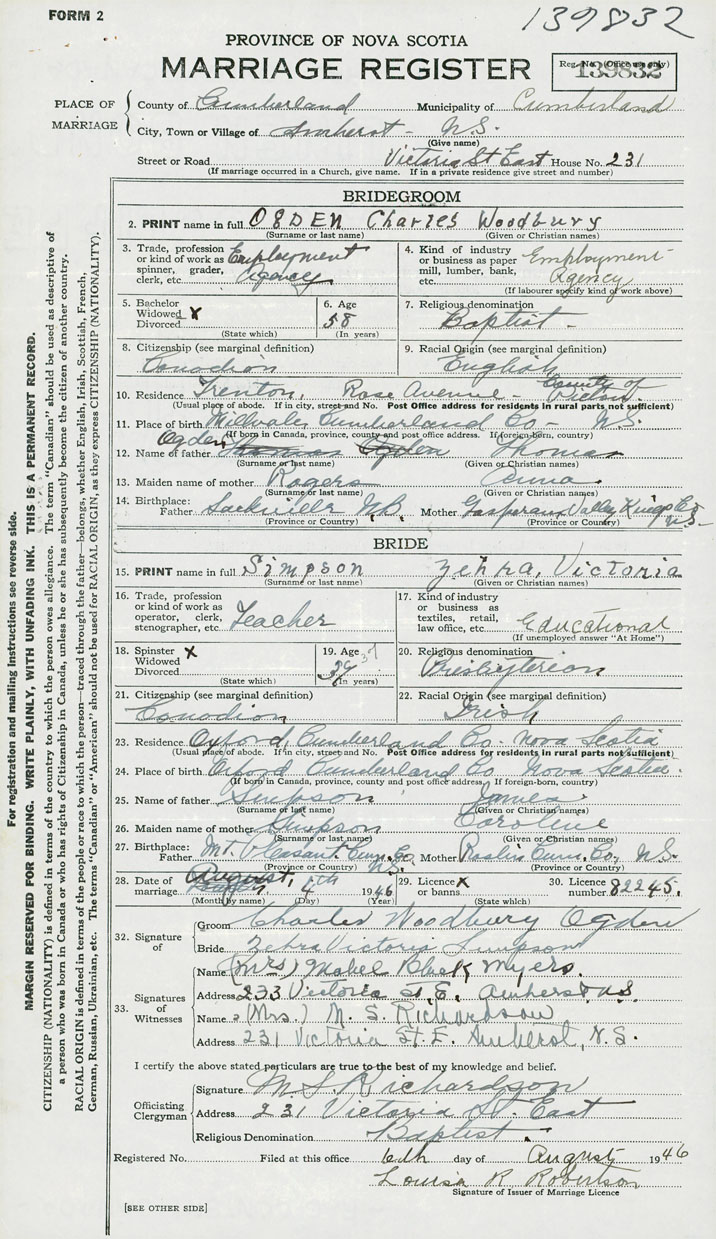 28. Date of marriage August 4 1946 29. By license or banns License 30. License number 82245