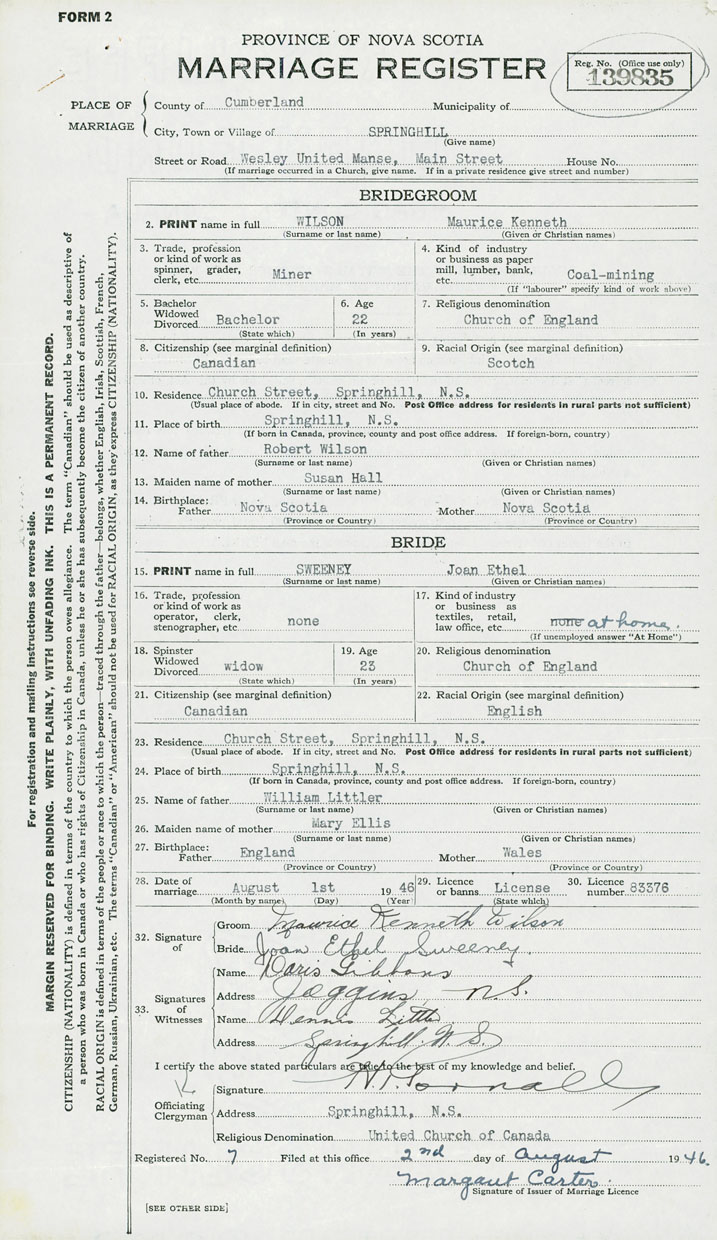 28. Date of marriage August 1 1946 29. By license or banns License 30. License number 83376