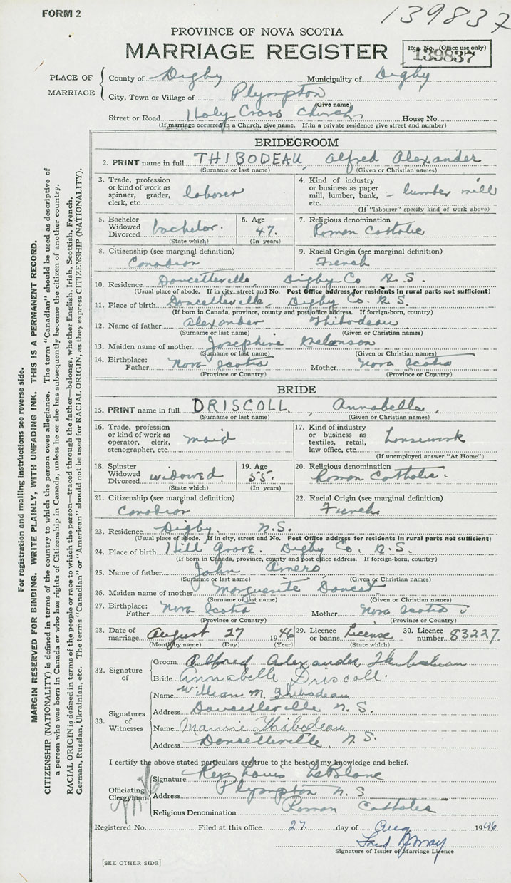 2. PRINT name in full Thibodeau, Alfred Alexander