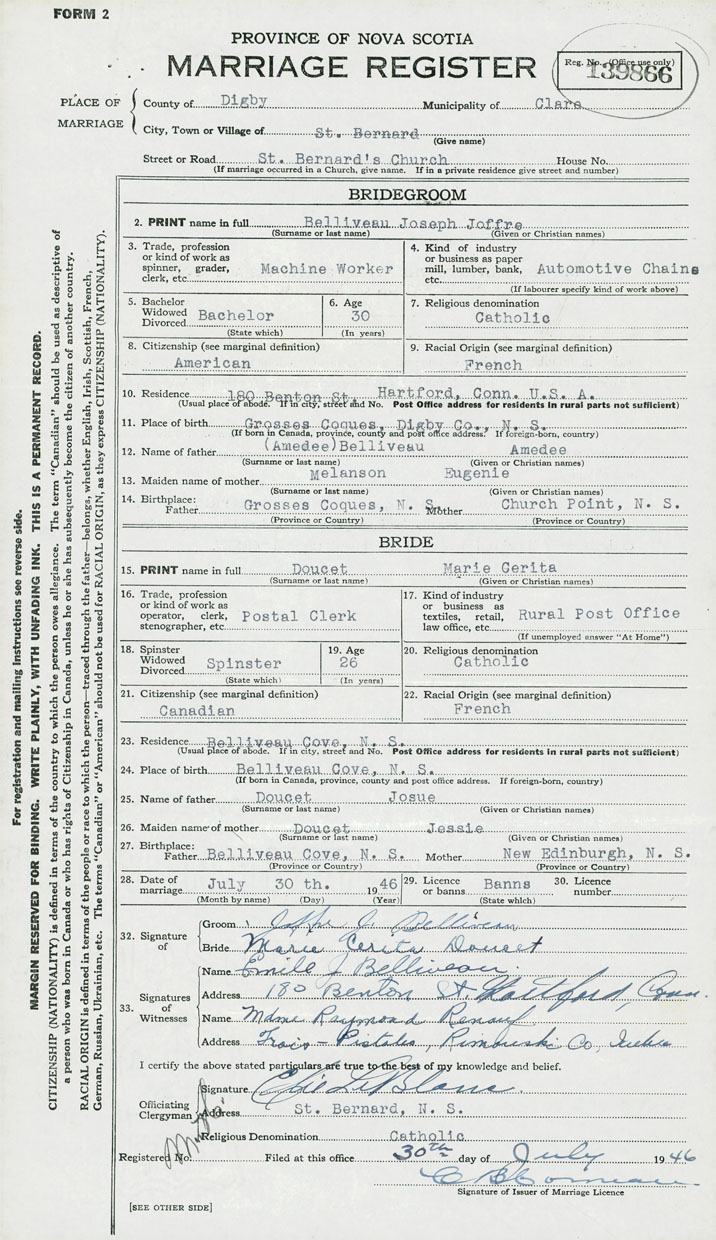 27. Birthplace Father Belliveau Cove Mother New Edinburgh