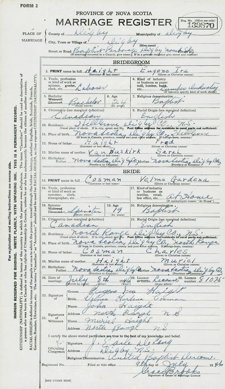 28. Date of marriage July 8 1946 29. By license or banns License 30. License number 81075