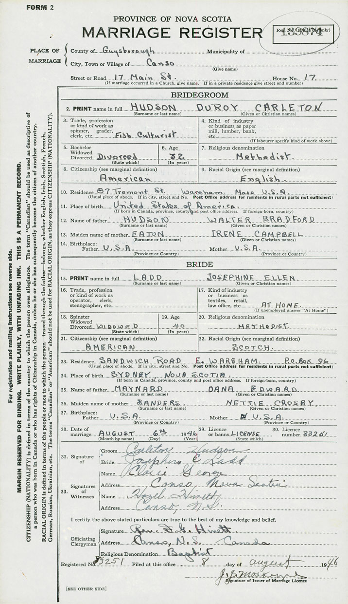 28. Date of marriage August 6 1946 29. By license or banns License 30. License number 83251