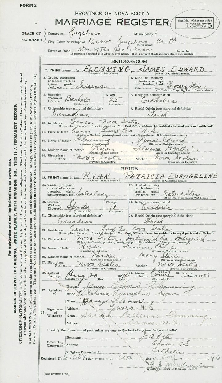 28. Date of marriage August 20 1946 29. By license or banns License 30. License number 21059