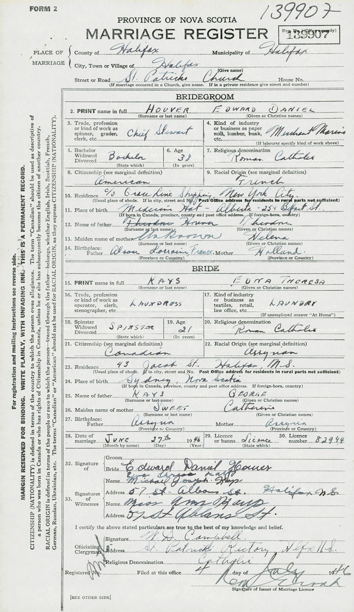 28. Date of marriage June 27 1946 29. By license or banns License 30. License number 82944