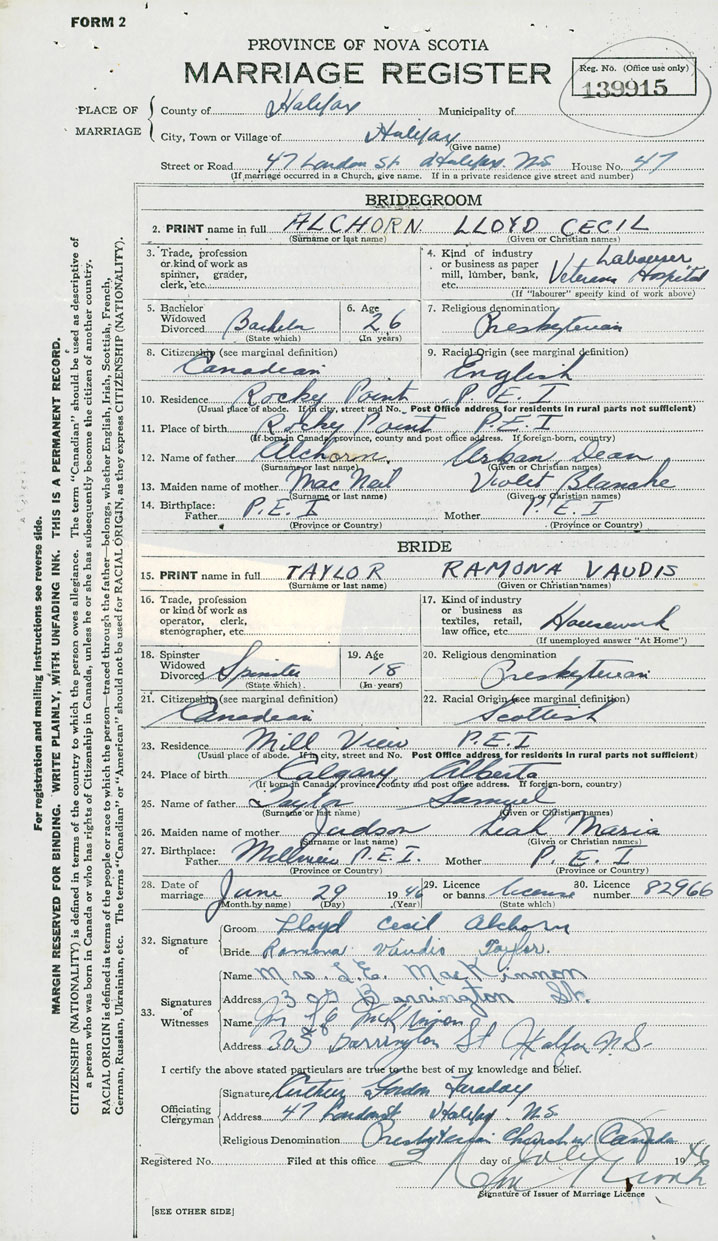 28. Date of marriage June 29 1946 29. By license or banns License 30. License number 82966