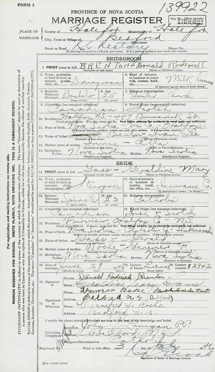 28. Date of marriage June 29 1946 29. By license or banns License 30. License number 82942