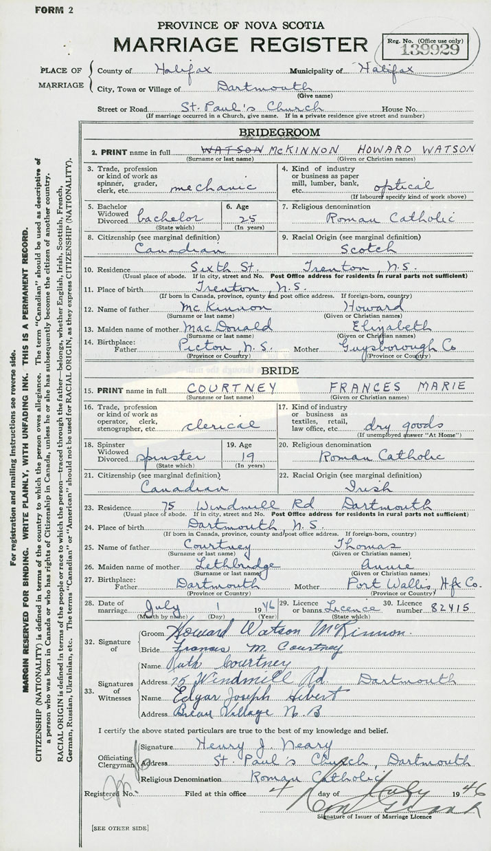 28. Date of marriage July 1 1946 29. By license or banns License 30. License number 82415