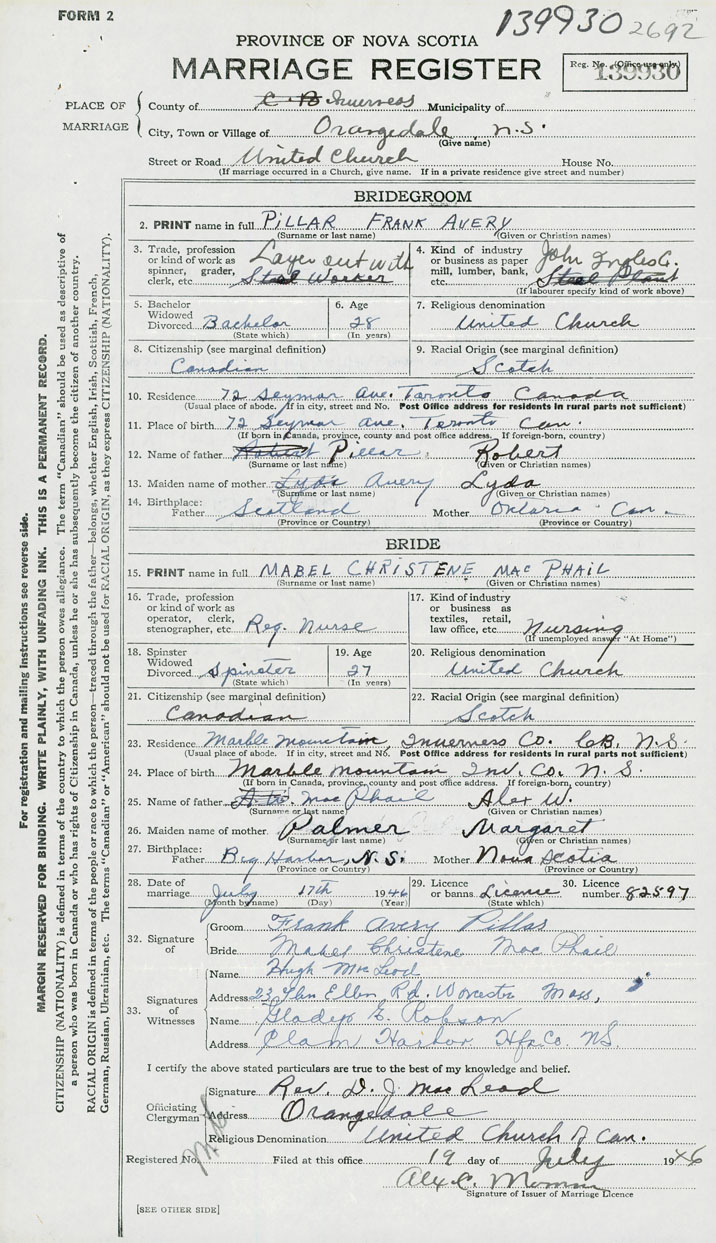 28. Date of marriage July 17 1946 29. By license or banns License 30. License number 82597