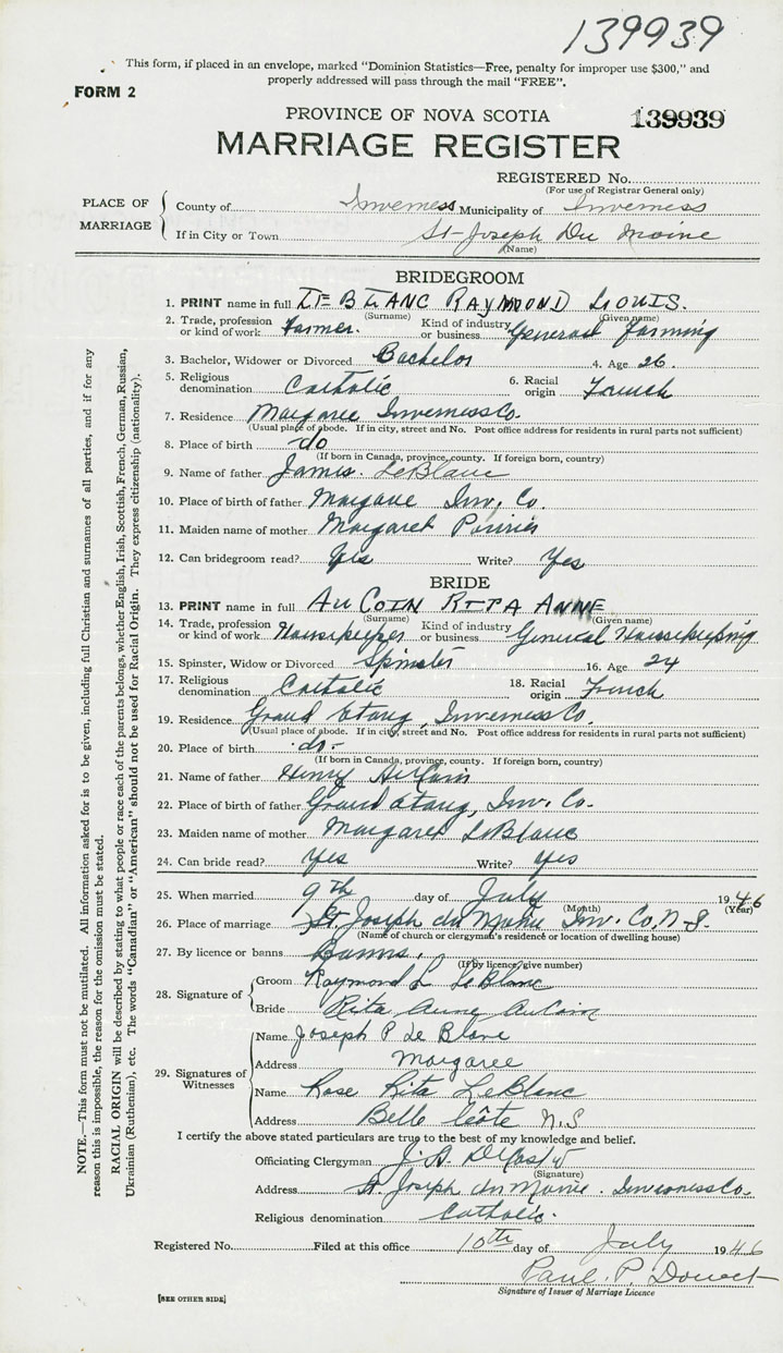 PLACE OF MARRIAGE County of Inverness in City or Town St. Joseph du Moine