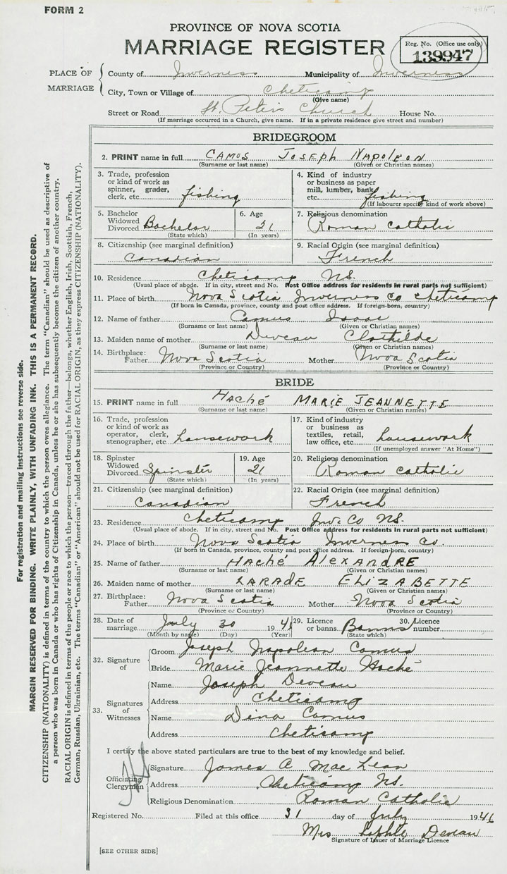 11. Place of birth Nova Scotia, Inverness County, Cheticamp