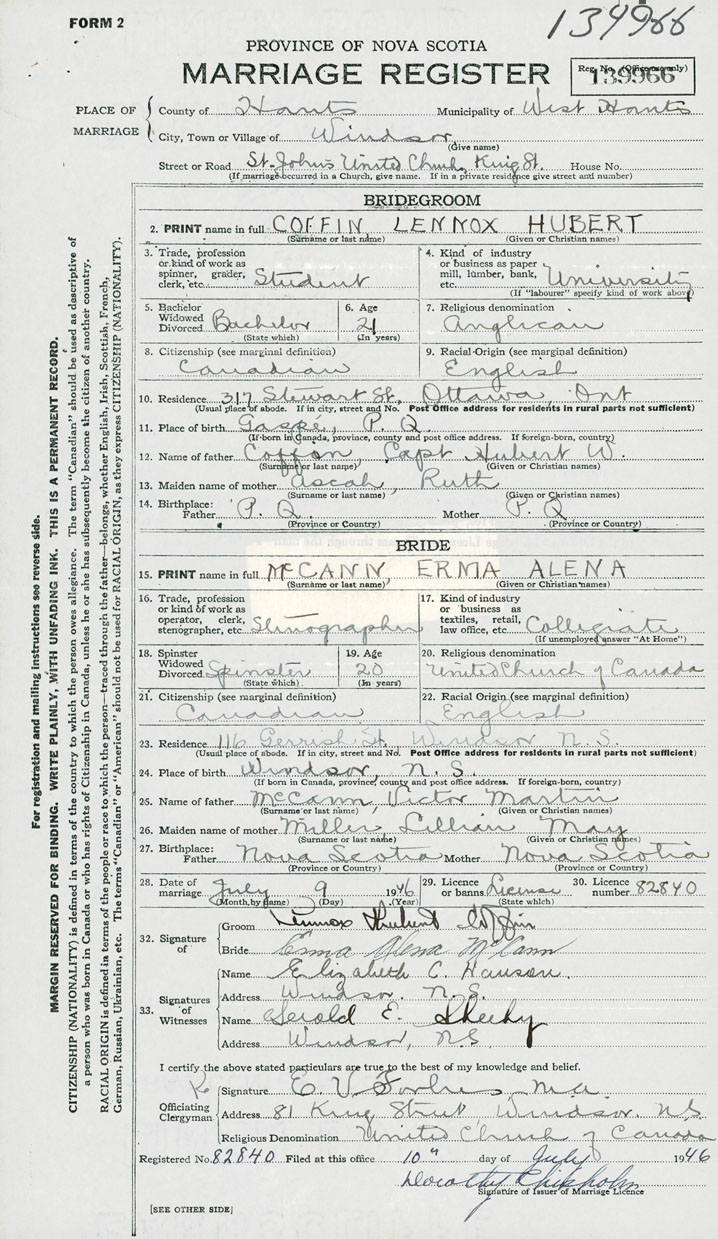 28. Date of marriage July 9 1946 29. By license or banns License 30. License number 82840