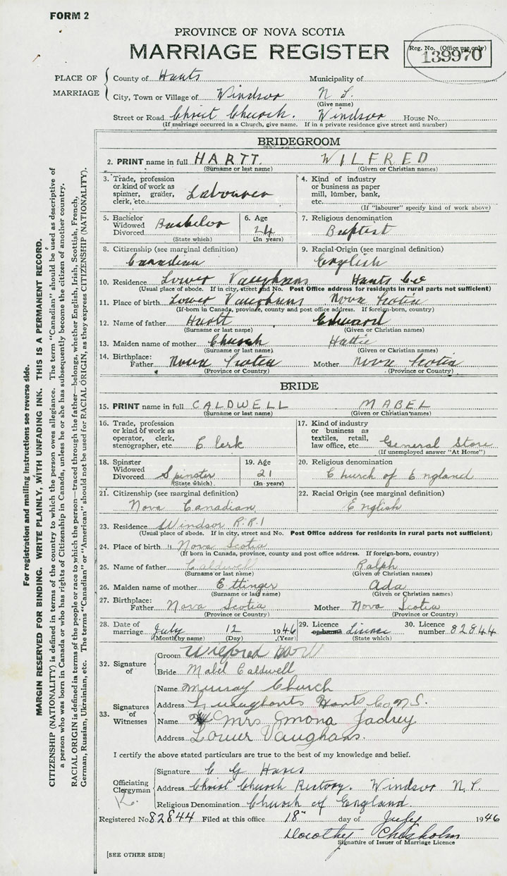 28. Date of marriage July 12 1946 29. By license or banns License 30. License number 82844