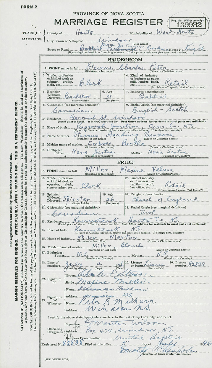 28. Date of marriage July 4 1946 29. By license or banns License 30. License number 82838