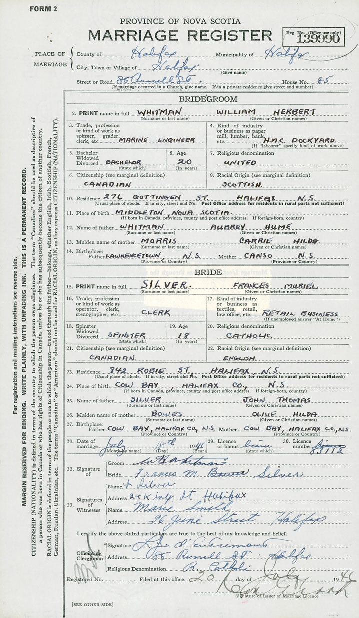 28. Date of marriage July 18 1946 29. By license or banns License 30. License number 83112