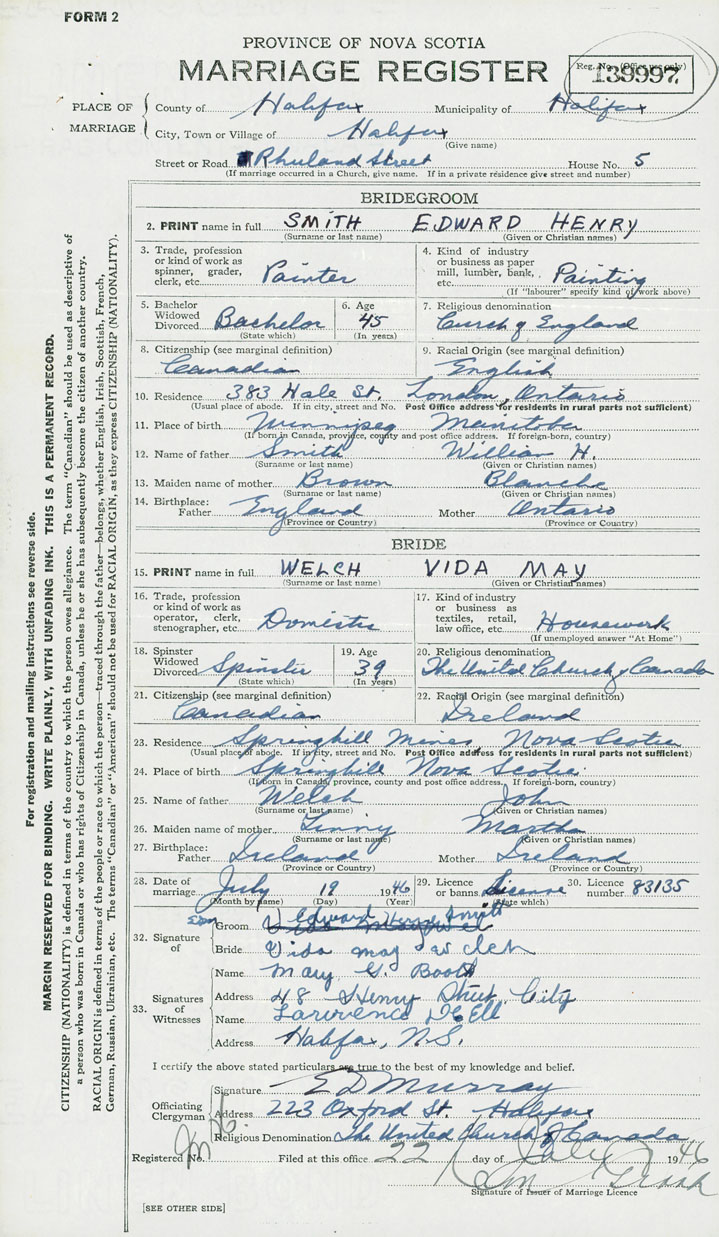 28. Date of marriage July 19 1946 29. By license or banns License 30. License number 83135