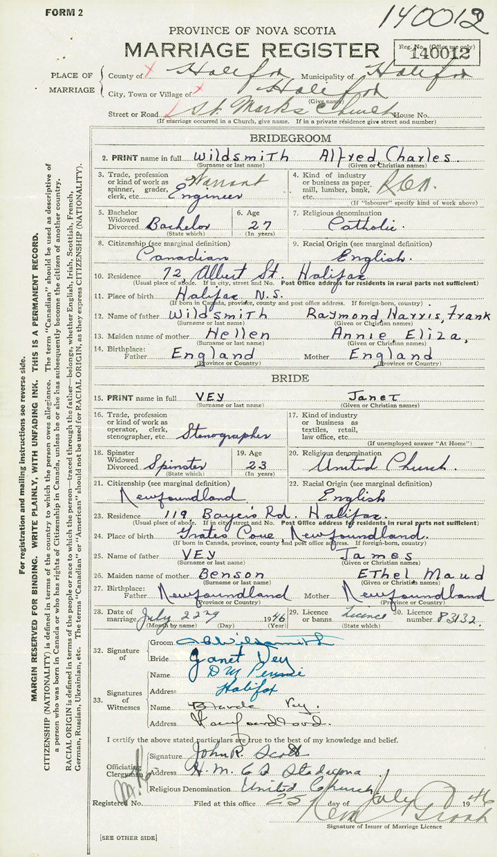 28. Date of marriage July 22 1946 29. By license or banns License 30. License number 83132