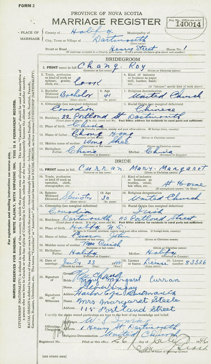 28. Date of marriage July 23 1946 29. By license or banns License 30. License number 83326