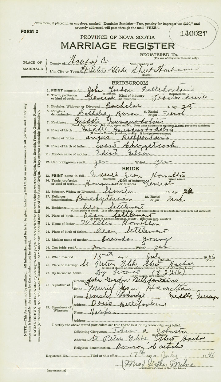 26. Place of marriage St. Peters Glebe Sheet Harbour, Halifax County