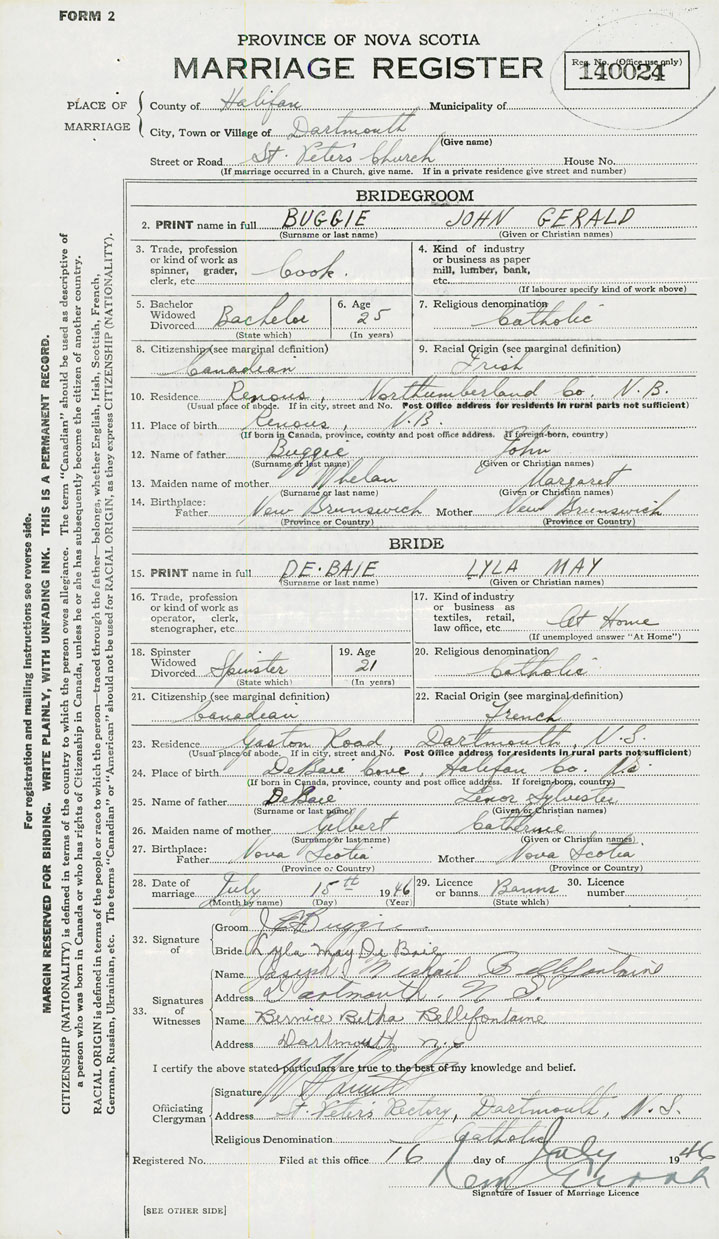 28. Date of marriage July 15 1946 29. By license or banns License 30. License number