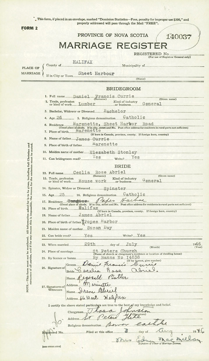 26. Place of marriage St. Peters Church Sheet Harbour, Halifax County