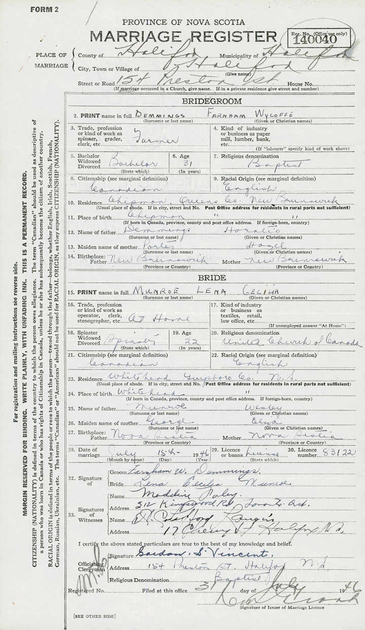 28. Date of marriage July 15 1946 29. By license or banns License 30. License number 83122