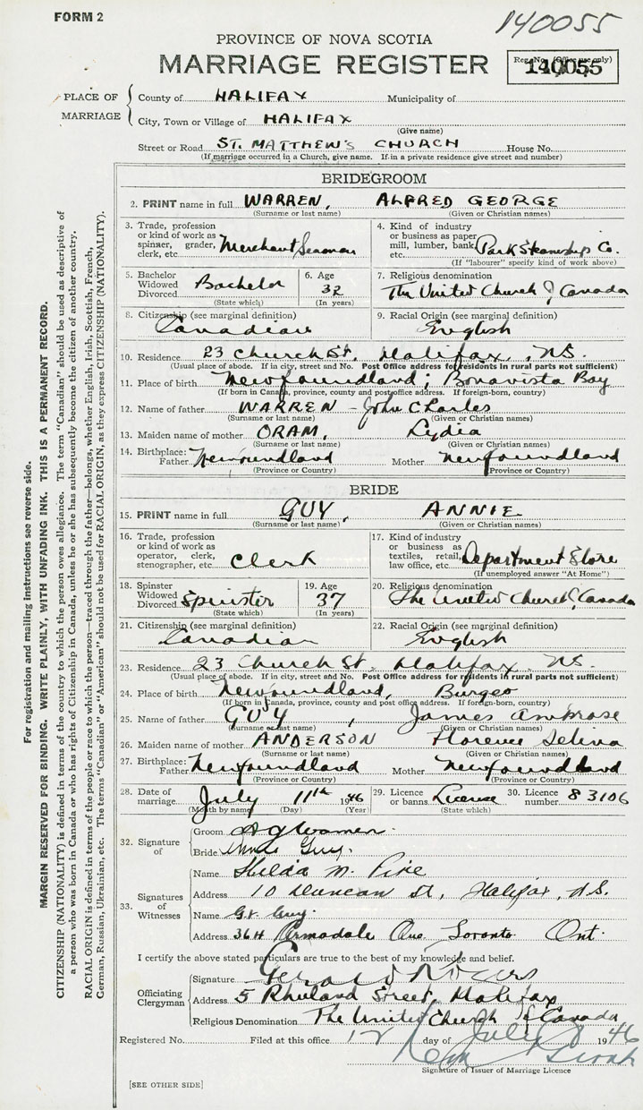 28. Date of marriage July 11 1946 29. By license or banns License 30. License number 83106