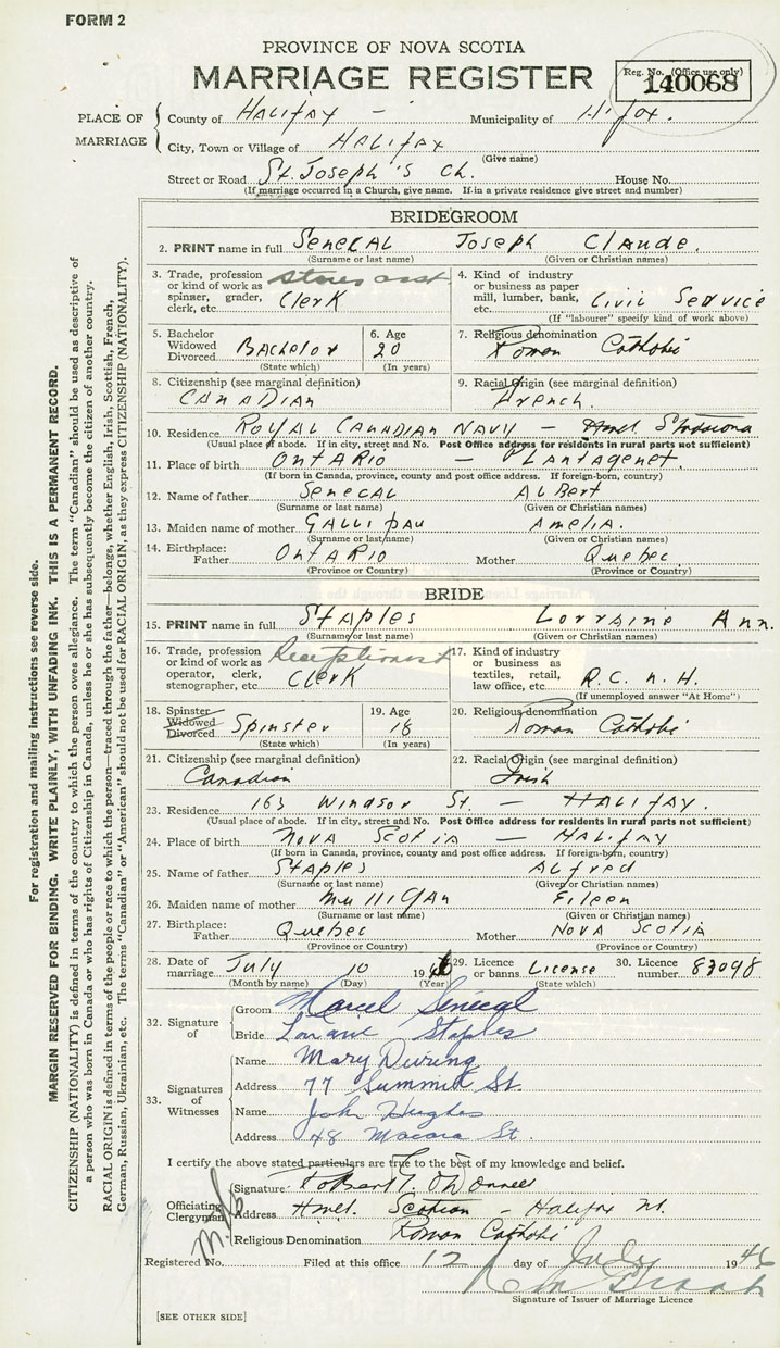 28. Date of marriage July 10 1946 29. By license or banns License 30. License number 83098
