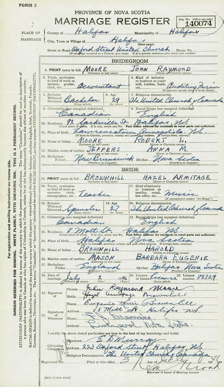 28. Date of marriage July 2 1946 29. By license or banns License 30. License number 82729