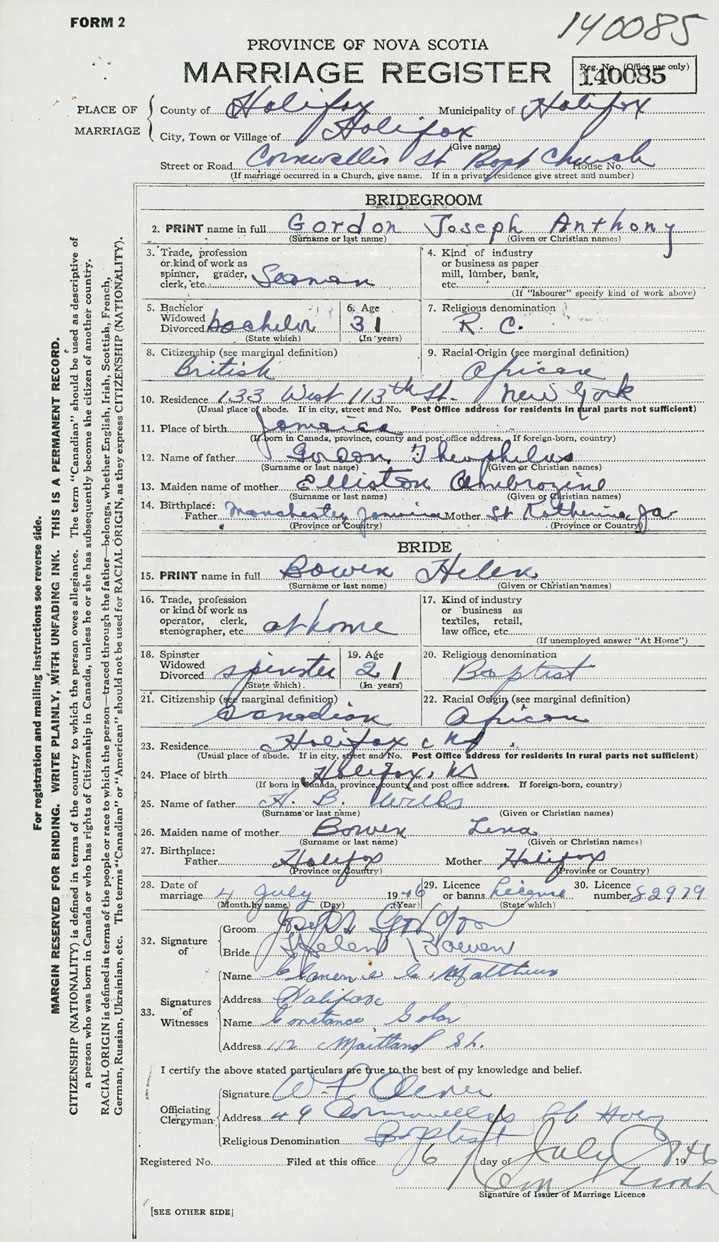 28. Date of marriage July 4 1946 29. By license or banns License 30. License number 82979