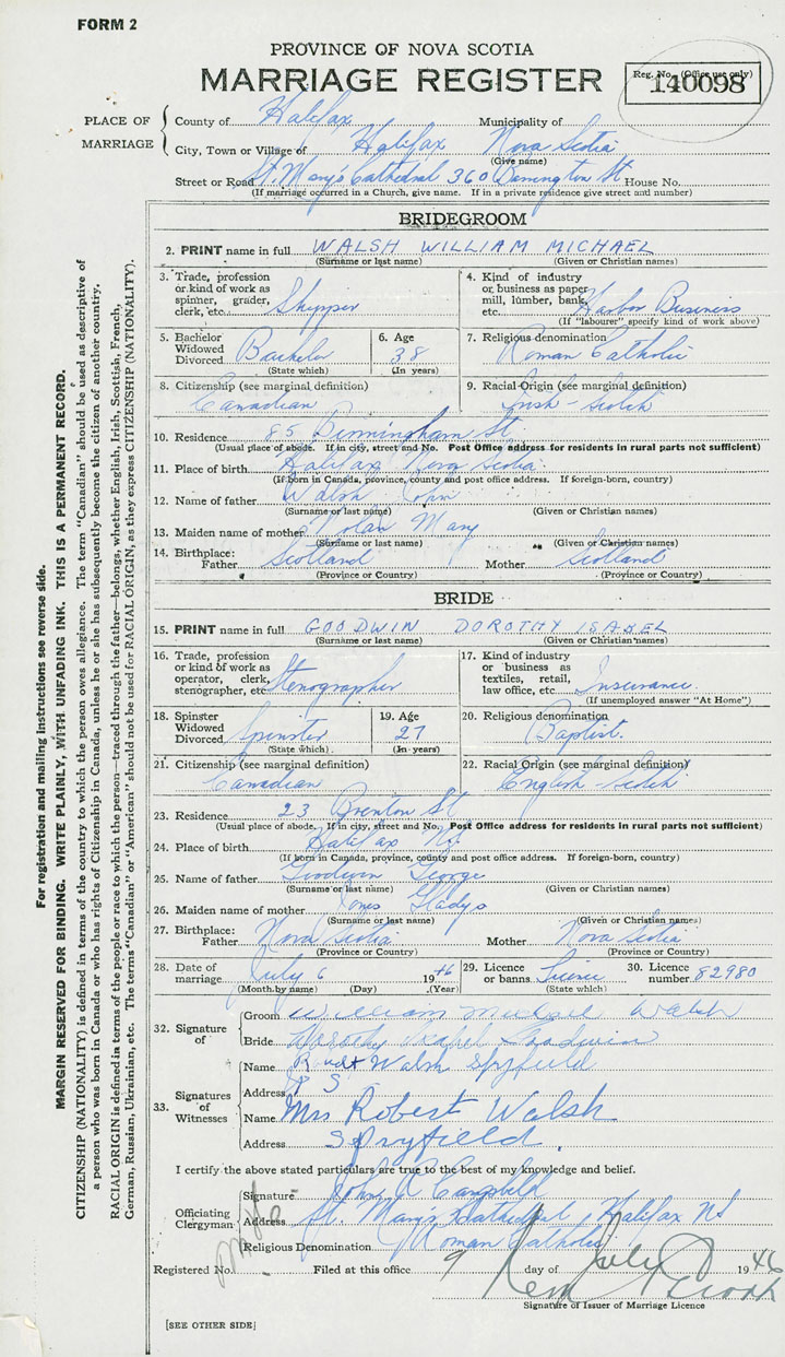 28. Date of marriage July 6 1946 29. By license or banns License 30. License number 82980