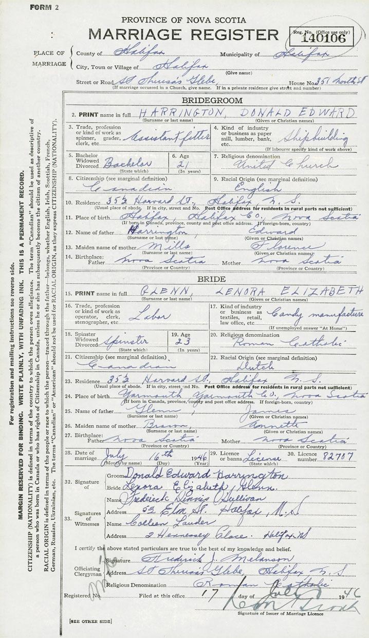 28. Date of marriage July 16 1946 29. By license or banns License 30. License number 82707