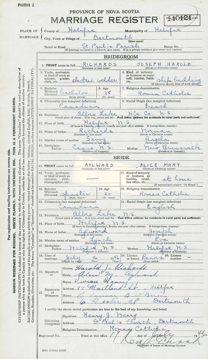 28. Date of marriage July 16 1946 29. By license or banns License 30. License number