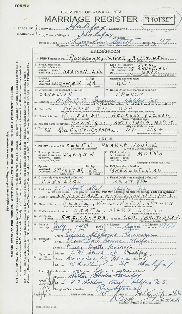 28. Date of marriage July 14 1946 29. By license or banns License 30. License number 83121