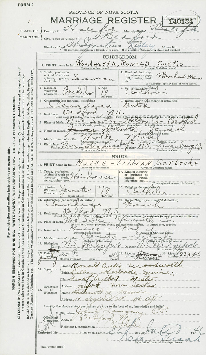 28. Date of marriage July 25 1946 29. By license or banns License 30. License number 83346