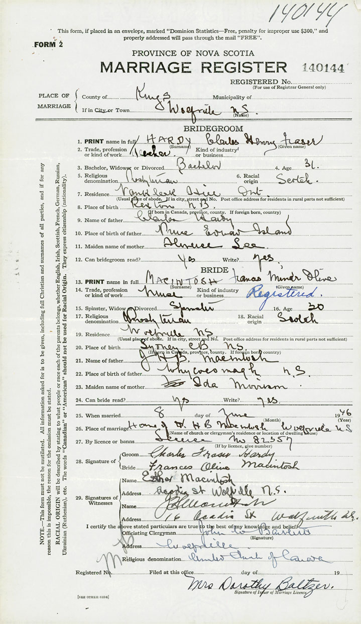 26. Place of marriage Home of J.H.B. MacIntosh Wolfville, Kings County