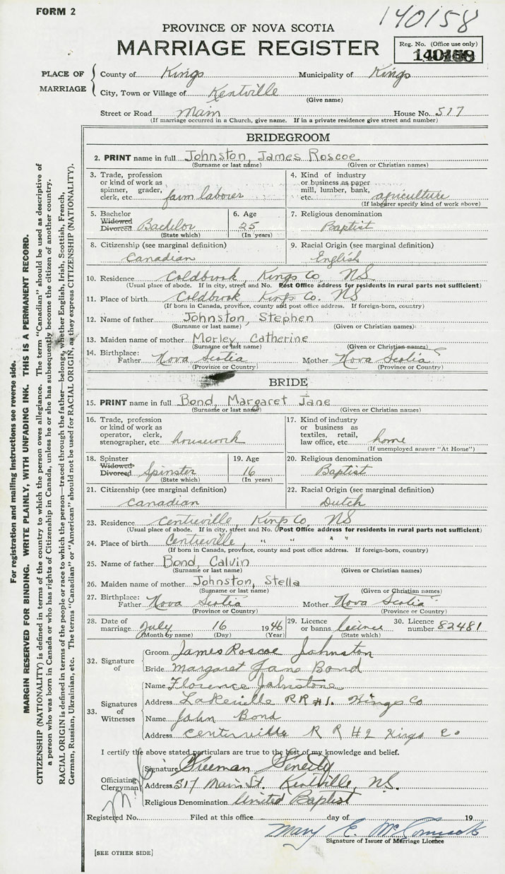 28. Date of marriage July 16 1946 29. By license or banns License 30. License number 82481