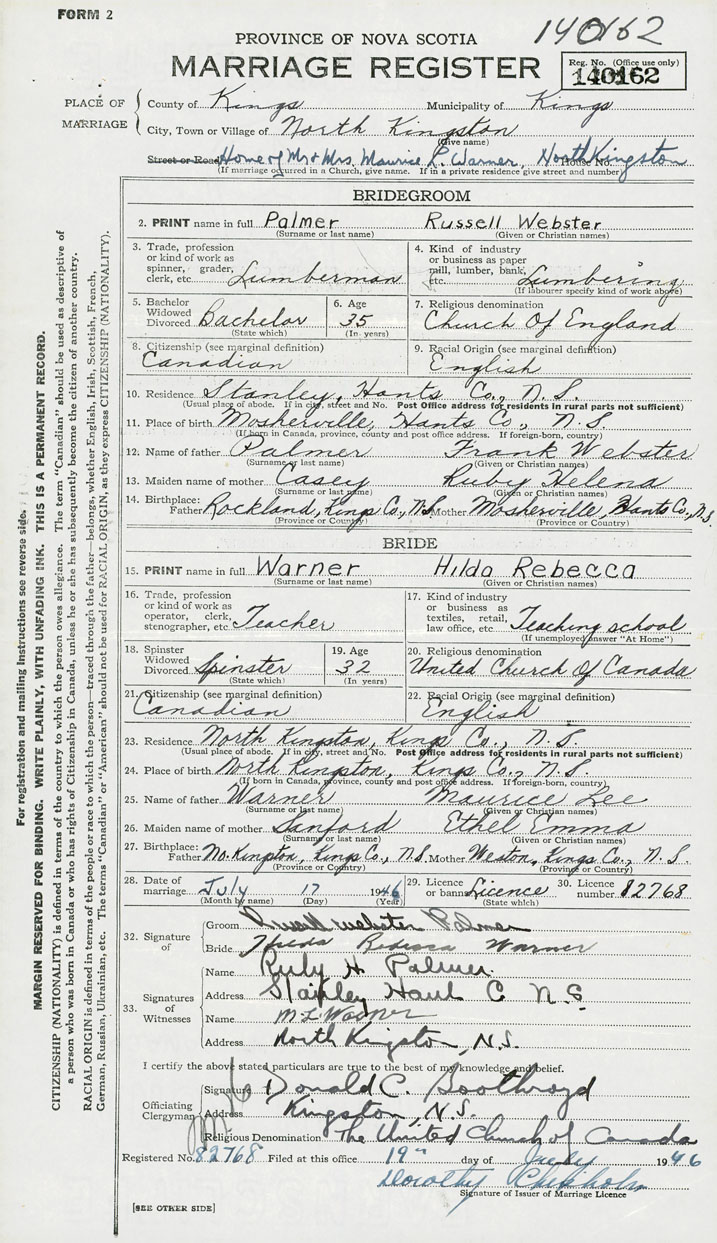28. Date of marriage July 17 1946 29. By license or banns License 30. License number 82768
