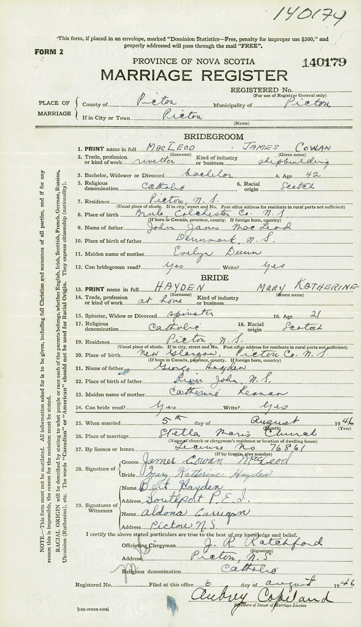 26. Place of marriage Stella Maris Church Pictou, Pictou County